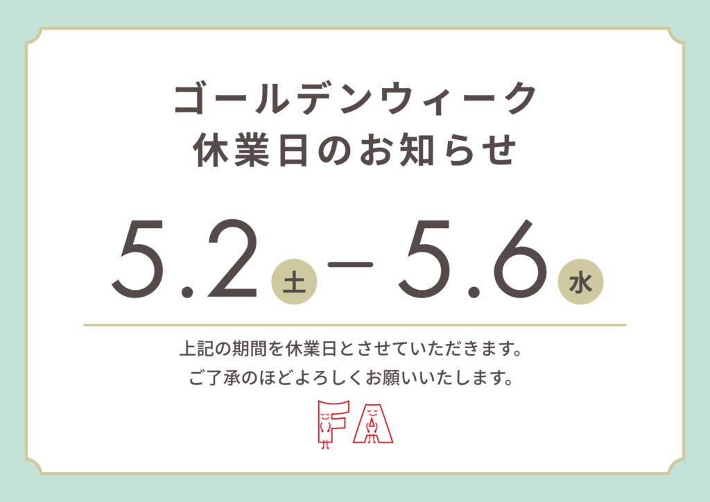 - 5月2日(土) ~ 5月6日(水) 休業日